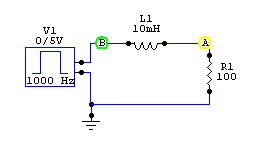 下図はCircuitMakerによるシミュレーション結果です。緑色が抵抗・コイルに加えている電源波形、黄色はコイル両端の波形です。コイルそのものは抵抗がありませんから、電流が流れても抵抗による電圧は発生しません。ここでは、入力電圧の変化時に電圧が発生しています。これは、磁場を生成・消滅するときに発生する電圧になります。