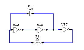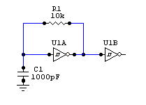 下図はNOTゲートによる発振回路です。U1Aの入力がLのとき、U1CはRを通してC1を充電します。充電が進み、U1Aの入力がHになると、U1Cの出力が反転し、C1を放電します。