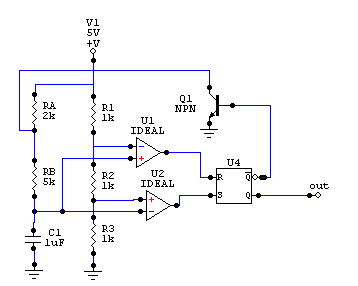 左の、RA,RB,C1が外付け部品です。C1はRA、RBを通して充電されます。C1の電圧が、U2の+端子(電源電圧の1/3)を越えると、U3のラッチのRをLにしますが、これは、ラッチの状態を変化させません。C1の電圧が、U1のー端子(電源電圧の2/3)を越えるとU3のR端子をHとし、ラッチを反転させます。これは、Q1をオンとしC1をRBを通して放電を開始します。これが、U2の+端子の電圧より下がると、U4のラッチを反転させて放電を停止させ、再度充電を開始します。
