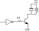コレクタの回路にリレーやモータ等、コイル(電磁石)を接続する場合注意が必要です。コイルはその性質上、流れている電流を急激に停止しようとすると、数千ボルト以上の電圧をだして、電流を持続しようとします。この、電流を吸収するためには、図のようにコイルの両端にダイオードを接続します。このダイオードはコイルに蓄積されたエネルギーを吸収するのが目的です。