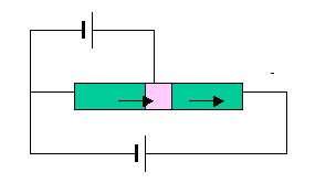 CにB,やEより高い電圧を加えます。このままでは、E-C 間に電流は流れません。この状態で、B端子にE端子より高い電圧を加えます。すると、B-E間はダイオードの順電圧になるため、B
