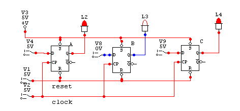 下図は3ビットのレジスタです。まず、リセット(reset)を0にして、すべてのFFを0にします。