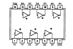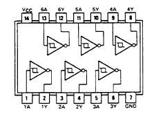 シュミット型入力を持つ代表的なTTL素子は7414です。素子の中にある2重線のマークがシュミット入力であることを示します。