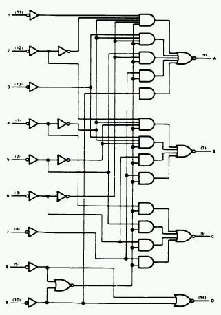 デコーダと逆で、10本の信号のどれか1本が0になったとき、その信号線の2進数を D,C,B,A に出力します。同時に複数の信号が1にならない場合、入力信号線を節約できます。