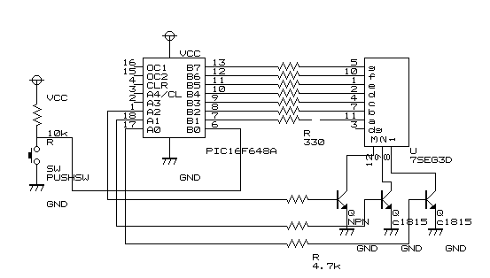 利用する数字表示は、ー側(カソード)が各素子共通になっ手射る場合をカソードコモン、+側が共通になっているタイプをアノードコモン型といいます。