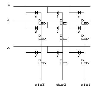 横線が、a,..,g の各素子に接続されます。各7素子は共通に接続されており、dig3,dig2,dig1の各信号線をGND(0V)に接続すると対応する7素子が発光します。例えば、dig1