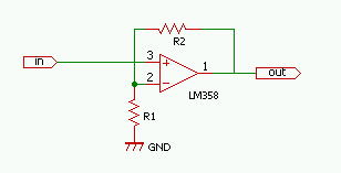 PICは 0Vから5V の値をAD変換しますが、一般にセンサーからの信号はこれより小さくなります。そこで、オペアンプ(演算増幅器)を利用します。これは、図のような回路を組むと、出力は入力の
