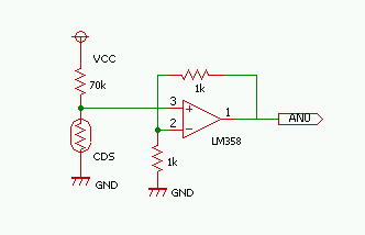 CDSの抵抗を r kΩ(Ω) としたとき、 出力電圧は 5 * ( r / ( r + 70) ) となることを確認してください。