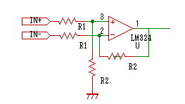 下図は 二つに信号の差 (IN+ - IN-) を計算し、(R2/R1) 倍するOPアンプ回路です。二つのR2とR1は同じ値にする必要があります。