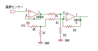 IN- に1V を設定し、 R2/R1 を 4程度 に設定すれば、目的の回路になります。しかし、IN+ にセンサの信号を接続すると、センサの電圧が変化してしまいます。そこで、次のように、バッファー回路をセンサーとOP差分回路の中間に入れます。1Vの電圧は、5Vの電源電圧を二つの抵抗で分圧して作ります。