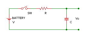 抵抗と容量Cのコンデンサを直列に接続して電圧 V をかけると、コンデンサへの充電が開始されます。充電するとコンデンサの両端の電圧があがります。電源電圧になると充電が停止し、このとき、Q=C・V