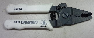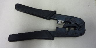 圧着用端子を配線とともに圧着して接続します。電話線、LANケーブル用の工具です。