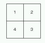 Pixels2[]を元画像の横(下図の2)に描画します。次に、Pixels2[]を上下反転し、これを、右下(下図の3)に表示します。最後に、Pixels1[](元絵)を上下反転しPixels2[]に記録し、これを左下(下図の4)に表示します。