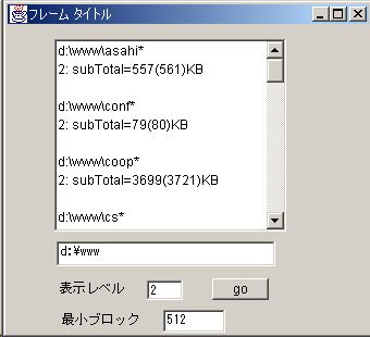 結果を表示するリスト、サイズを調べるディレクトリ、表示する最低レベル、ブロックサイズ、を指定するテキストボックス、処理を開始するgoボタンを配置します。
