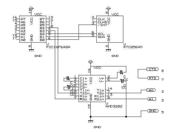RTCとPICはI2Cで接続します。PIC側の端子はB1,B2です。この端子はPIC16F648ではRs232Cと共通ですからシリアル接続はハードウエアでなく、ソフトウエアで行うこととし、B4,B3にシリアル端子を接続します。RTCのINT信号をPICのRB0(外部割込み端子)に接続します。