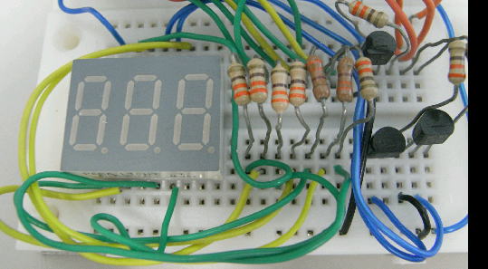 先に1桁の数字表示を紹介しましたが、この方法で3桁を表示すると1桁当たり7本の信号が必要ですから、3*7本の接続が必要になってしまいます。ここでは、動的表示を利用して、7本+3本で3桁の表示が可能にする方法を紹介します。