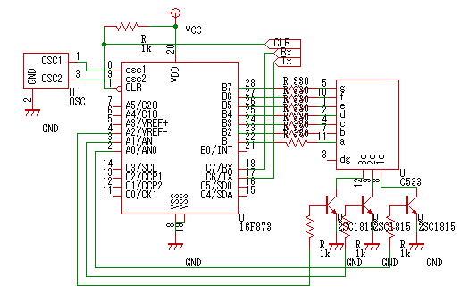 PICの出力は20mA程度の電流しか流せません。したがって、7素子の桁信号(dig2,1)をPICの端子に直接接続することはできません。トランジスタをスイッチとして利用すると、100mA〜1A