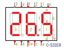3桁の7素子表示器 C533 は数字を表示する7素子の端子以外に、桁を指定する dig3,dig2,dig1の信号線があります。この信号をGND(0V)に接続すると対応する桁の7素子が発光します。