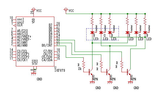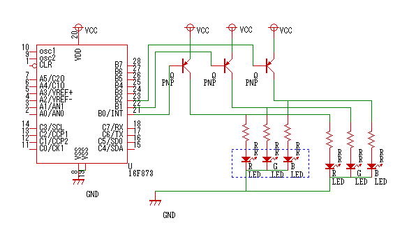 カソードコモン型LEDを同じパターンで複数点灯する場合は次のように、PNP型トランジスタ(2SA1015)を利用します。トランジスタ1個で10個くらいのフルカラーLEDを同時に点灯できます。この場合、PICの端子がLのときLEDが点灯しますから、プログラムで設定しているPICの端子の値(output_high