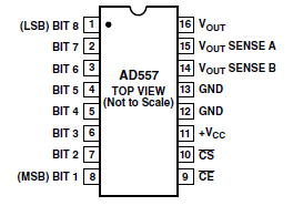 AD557 でアナログ電圧に変換され正弦波として出力されます。正弦波の周期は、for() ループの中の遅延関数 delay_us(35) で決定されます。これは、35マイクロ秒の遅延で、64回の繰り返しで1周期ですから、2.24m秒
