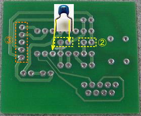 - 配線面で、ICの内側にコンデンサを2つ取り付けます。この時、左側のコンデンサは、回路が切れている方の端子(左側)を曲げて出しておき、まず、切れていない方の端子(右)だけをはんだ付けします。左の端子は上の写真のように、左下の端子に半田付けしますが、4でICソケットを取り付けた後半田付けします。
