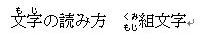 書式メニューの「拡張書式」では、次のような「ルビ」や「組文字」を作成できます。「ルビ」はルビをふりたい漢字を選択し、拡張書式から「ルビ」を選択します。「組文字」は、予め、2行にくむ文字を入力しておきます。この文字を選択し、「組文字を選択します。