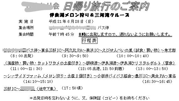 左の実施日、場所、字間は均等割り付けします。灰色で消えている部分はあなたの地区の名前にしてください。時間の2重線は下の文字を選択後、書式メニュー>フォント>下線で設定します。