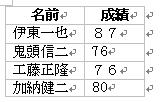 ワードで差し込み表を作成します。先頭の行に、各項目の名前(名前、成績など)を記入します。数行、適当に名前と行のデータを書き込み、表だけの文書を