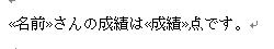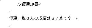 簡単のため、次のような2行だけの文書を配布します。<伊東一也>と<87>は差し込みデータから、差し込まれています。