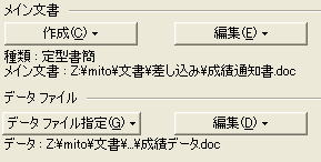 次に、「データファイル指定」の▼をクリックし「データファイルを開く」を選択します。すると、ファイル選択ウインドウが開きますから、先に保存した差し込みデータファイル(成績データ.doc)を選択します。