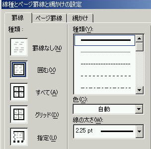 表の上でクリックし、罫線メニューの「線種とページ罫線...」をクリックすると、下の画面が現れます。線種を実線、線の太さを2.25、とし、「囲む」を選択して、ok ボタンを押すと、外枠のみが太くなります