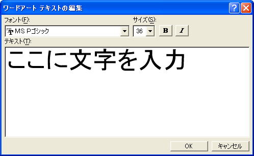 好きな形をクリックすると文字入力画面が出ます。文字とサイズなどを指定し OK ボタンを押すと図として表示されます。