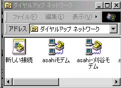 wuindow2kでは、マイネットワークを右クリックし、プロパティのメニューから「ダイアルアップネットワーク」ウィンドウを表示します。「新しい接続」をクリックします。(ウインドウ95/98)では、マイコンピュータに「ダイアルアップ接続」があります。