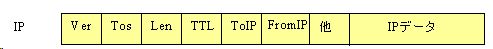 ネットワーク層で送受信されるデータをデータグラムと呼びます。データグラムは、フレームの先頭部分に、送り先のIPアドレス(ToIP)と送り主のIPアドレス(FromIP)などを指定したIPヘッダを記録します。経路制御はこのIPヘッダを元に、データグラムを送り先を決定します。IPヘッダは合計24バイトになります。