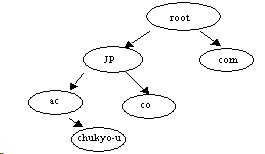 ドメイン名は階層構造を持っています。最後のjpがjapanに国名、acはacademicで業種、chukyo-uがチ中京大学の名前になります。先頭のwwwはホームページサーバーの名前になります。情報科学部の場合、