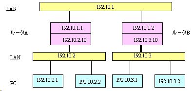 下の図で、二つのIPを持っている箱がルータです。192.10.2、192.10.3、の二つのクラスCのイーサネットをルータを用いて192.10.1のLANで統合する例を示します。ルータAは190.10.2のネットワークのゲートウエイ、ルータBは190.10.3のネットワークのゲートウエイとなっています。