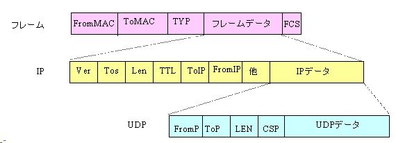 LAN上では送り主と宛先のMACなどを先頭に持ち、フレームデータを内容とするフレーム構成のデータが流れます。フレームデータは、送り主と宛先のIPを明示したIPヘダとデータから構成されます。このIPデータは、さらに、宛先と送り主のポート番号とUDPデータから構成されます。UDPデータには実際のデータ(情報)が記録されます。