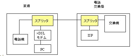 電話機の音声信号とxDSLの信号はスプリッタによって分離/併合します。PCからxDSLまでの接続はCATVの場合と同様です。xDSLモデム電話側の信号をスプリッタに接続します。PCからの信号は電話機からの信号と混ぜ合わせられて電話線に送られます。逆に、プロバイダからの信号はスプリッタで分離されネットワークの信号のみが、xDSLモデムに届きます。したがって、PCのインターネット利用と電話機は同時に利用できます。
