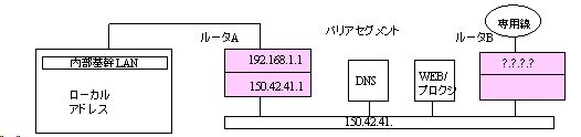 内部からのインターネットの要求はルータAを通り、プロクシサーバーから結果を受け取ります。webサーバーはルーターBを経由して、専用線を利用してインターネットに接続しデータを受け取ります。ルーターBの専用線側のIPは接続する上位のドメインのIPアドレスとなります。