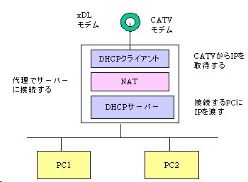 ルータには複数のLAN側端子と、一つのWAN側端子があります。LAN側に接続するPCにはDHCPでプライベートIPを渡します。WAN側はCATVたxDL側より、IPを受け取ります。ルータはLAN側のゲートウエイとなり、PCからのインターネットへのアクセス要求を受け取り、送り主のIPとポートを自分のWAN側の番号に置き換えて送ります。